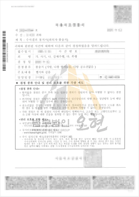 결과는 3개 혐의 모두 불송치(혐의없음/공소권없음)였습니다. 자칫하면 사기꾼, 폭행범, 성범죄자라는 세 가지 주홍글씨가 새겨진 채 평생을 살아야 했던 의뢰인은, 오현의 체계적인 조력 덕분에 단 한 줄의 전과도 남기지 않고 다시금 평범한 직장인으로 돌아갈 수 있었습니다.